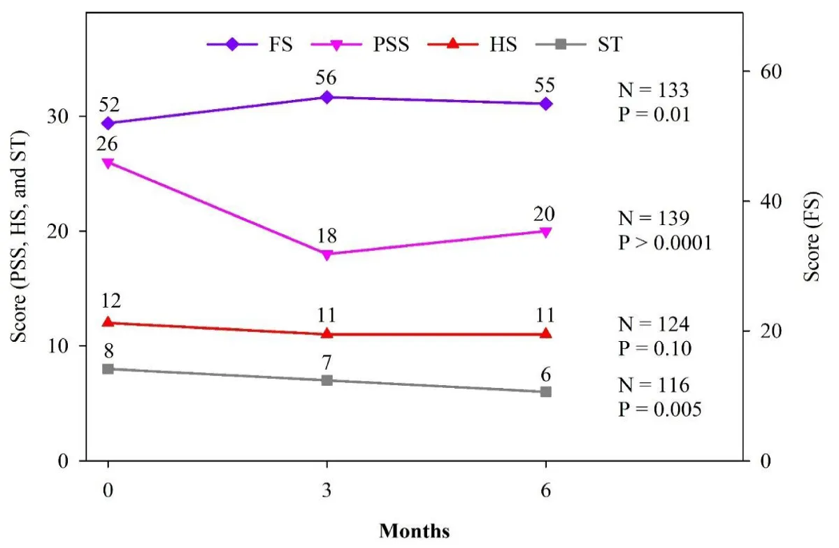 Completion of follow‑up assessments declined over time, with most students not completing surveys at 9 and 12 months, leading analyses to focus on baseline, 3‑month, and 6‑month data. Despite this attrition, comparisons between completers and non‑completers showed no statistically significant differences in age, race, ethnicity, or gender at either 3 or 6 months, suggesting limited systematic bias due to loss to follow‑up. For example, mean age and the proportion of Hispanic/Latino students were similar across groups at both time points, and the proportion of non‑Caucasian students and females among completers did not differ significantly from non‑completers (Table 2).