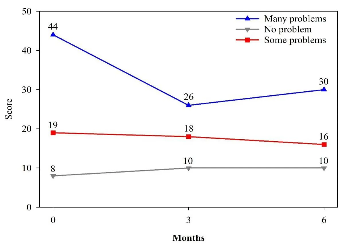 When outcomes were stratified by baseline severity and impairment, youth with the highest initial problem severity and functional impairment experienced the greatest gains. Among those with many problems at baseline, problem severity scores decreased by 11 points (n = 33, p < 0.0001, d = 1.29), whereas changes were smaller and not statistically significant for youth with some or no baseline problems (Figure 2). Similarly, functioning scores improved most in youth with severe initial impairment (mean increase of 12 points, n = 20, p = 0.0015, d = 0.83), with smaller improvements among those with some impairment and minimal change among those without baseline impairment (Figure 3).