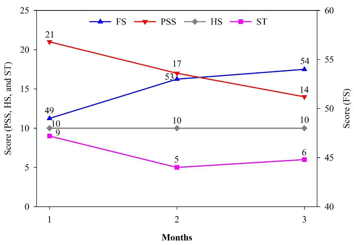 Figure 4: Parent results on Ohio Youth Problem Severity (PSS), Functioning (FS), Satisfaction with Treatment (ST), and Hopefulness Scales (HS).